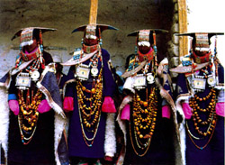 西边的阿里普兰地区盛行羔皮袍,制做精细、装饰典雅。羔皮袍的面料以毛呢为主,领、袖、襟底镶水獭皮,外套绸缎,这在整个藏区都是较具特色的。而普兰服装的最精美、最独特的却是妇女的“孔雀”服饰,它与阿里孔雀河的美名紧紧联系在一起。孔雀河源头似孔雀,它是美丽和吉祥的象征,为了使孔雀般的美丽和吉祥永生永世地存在于这块土地上,妇女们的装饰便模仿孔雀而流俗于今。妇女戴的帽子叫“町玛”,是棕蓝色彩线氆氇制做的圆筒帽,帽的底边截一段为留辫子处,妇女的耳坠以珊瑚及珍珠连串而成,长约15厘米。独特的帽子及耳坠象征孔雀的头冠,妇女背部系“改巴”,即背部围裙,“改巴”用毛色纯白光滑的山羊皮制作,正中部镶嵌带有圆形花纹的棕蓝色氆氇,是婀娜多姿孔雀的翅膀,底部开的三道叉口便是孔雀的尾羽。有的“改巴”皮面夹有色彩绚丽的绸缎,更具有非凡的风姿,犹如开屏孔雀临现眼前,美丽多姿。
