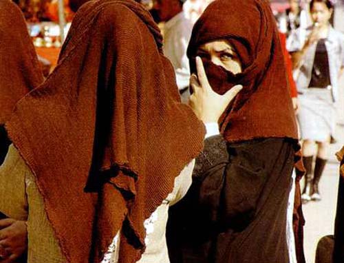 在新疆的喀什等地少数维吾尔族妇女头戴面纱。据伊斯兰教规定,妇女除手脚外,全身都是羞体,所以她们外出就要戴上盖头或面纱。戴面纱的妇女大都是受宗教影响较深或是宗教人士家庭的妇女。他们认为,妇女必需深居简出,不愿意外人轻易窥见。男人若窥见陌生女子的面容,就被认为是件不吉利和不幸的事情。但是,也有人说蒙面纱的起源是古代阿拉伯一带风沙大,蒙上面纱可以保护妇女的面部和防止落上尘土,有利于卫生。