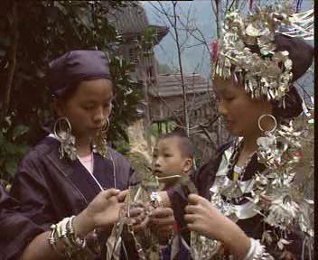 头饰 女孩自五、六岁开始蓄发,至十六七岁即开始用酸汤沉渣洗发,以清水冲洗干净待干,用头巾包好,待要去参加节日喜庆活动时才绾髻于脑后,并插上银饰。银饰与久敢式不同处是:花饰中,有蝶有花,用螺旋银丝焊接。
