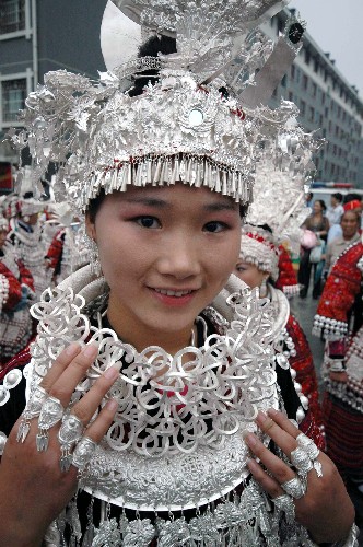 苗族戒指的戒面较宽,几乎遮住整个指根表面。戒面为浮雕花鸟或搂空花朵及绞藤等。对于佩戴位置没有明确规定。贵阳附近的苗族戴戒指,须戴八枚,拇指之外,每指一枚。