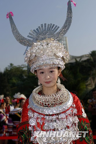 苗族的头饰包括银角、银扇、银帽、银冠、银箍、银围帕、银飘头排、银发簪、银插针、银顶花、银网链、银花梳、银耳环、银童帽饰。
