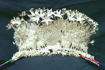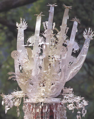 3?银冠:银冠是流行在施洞式、西江式、大塘式、久敢式、巫门式、稿旁式、雅灰式、八开式等服饰盛装中的头部银饰之一。施洞式银冠造型仿佛由银角演化而来,远视呈倒插的巨大木梳。边缘为一整块银片连成弓状又似牛角状,角尖为方孔钱式的放射纹装饰,银片表面为二龙戏珠浮雕图案,凹弓内以条状银片镶接。分大小两种,大者接4条银片,穿时插于头的前额髻上,小者接2条银片,穿时插于发髻的背后。每条银片的顶端立有银蝴蝶或银蜻蜓,作欲飞欲立状。两龙头中央的一蝴蝶支起的球状图案,球中镶一小圆镜象征龙珠,与二龙相配成二龙戏珠的画面。两龙头上为乘飞凤双人图,再上为两只飞凤,飞凰中央及两侧银片间空旷处为3只正面站立嘴含银坠的凤鸟。