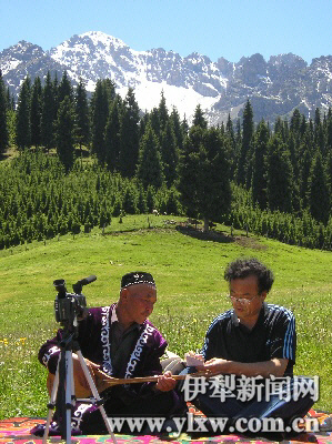 图为黄中祥博士在沙湾县鹿角湾夏牧场采访哈萨克族民间演唱艺人朱买·安尼瓦尔别克