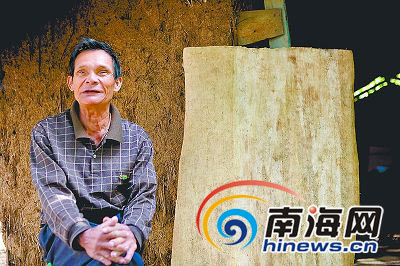 讲述到这里,黄运英开始从记忆中慢慢的走回来,走进屋里,拿出了一个树皮布的半成品,这是博物馆委托他做的一件树皮衣,黄运英告诉我们,现在见血封喉树很少了,制作这件树皮衣所用的树是相关部门特批的。因为现在树皮布已经退出了人们生活之中,只有博物馆需要馆藏或备研究之用老人才会经有关部门批准后砍树制作。