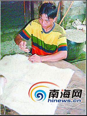 制作树皮布时用刀把圆筒状的树皮纤维剖开,再用竹针系上麻线缝制。