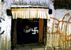 门上的“雍仲”和日月是藏族人最崇拜的符号