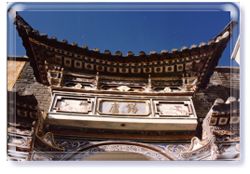 三房一照壁 由三间两层组成一个建筑单元,即由三栋带厦的房屋和照壁围成一个院落,庭院中种植花木。正中为主房,比两边房屋高,在主房和两边房屋相交处各有一个漏角天井,组合成一大二小的三个院落,所以又称“三合院”。这类民居在白族地区最普遍,给人以舒适华丽、绰约多姿的印象。院内各处装修都用木料,极其丰富华丽,千姿百态,互相争妍,其雕工技巧十分精湛。
