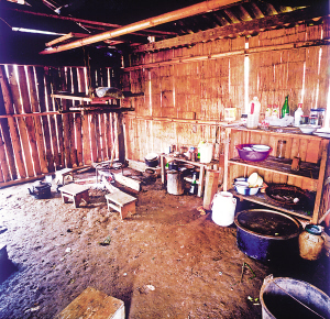房内一般隔成里外两间,里间狭小,光线暗,是主人的卧室,只放双人床和一小部分生活用品。外间宽大,是生火煮饭、聚会待客和子女就寝的地方。火塘设在里间屋的门外,放铁制三脚架,三脚架对应的方位有固定的用途,即靠里间房门一方为主人的座位,靠外间房门一方为客人的座位,火塘上方靠墙处为子女的床位。如有成年子女和新婚夫妇,则在外间再隔出小间,里间和外间存放着生产用具和酒具。房内几乎没有什么家具和装饰性的陈设,有的甚至没有桌椅和床铺,只在火塘周围铺着竹席或木板,合衣向火而眠。火塘上面1米多高处悬挂着竹编的约1米见方的架子,上面放着食具、盐巴、辣椒等,也是烘烤牛肉干的地方。架子上面靠房顶处并排放着几个粗大的竹筒,里面存放粮食。这几年的新村民居,在保持传统民居特征的前提下使用了新型建材,更坚固,更舒适。