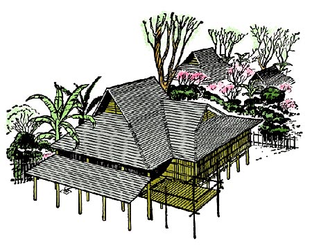 由于该地区盛产竹材,所以许多住宅用竹子建造,称为竹楼。粗竹子做骨架,竹编篾子做墙体,楼板或用竹篾,或用木板,屋顶铺草,主柱有24条。所以竹楼用料简单,施工方便而且迅速。