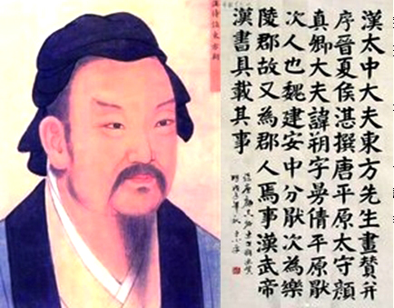 东方朔(前161——前93),本姓张,字曼倩,平原郡(今山东平原市南)厌次县(今山东惠民县东北)神头镇人,幼年失去父母,由兄嫂抚养长大。十三岁学书,经过三个冬天的学习,文史知识足够运用了。十五岁学击剑,十六岁学《诗》、《书》,诵读二十二万字。十九岁学习《孙吴兵法》关于作战布阵的才能,金鼓的指挥作用,也诵读了二十二万字。为人重然诺,信服子路的话,没有不兑现的诺言。汉武帝即位后,广征天下方正贤良文学材力之士。东方朔上书自荐,文辞不谦逊,极力夸耀自己,声称自己“身高九尺三寸,双目若明珠悬挂,牙齿似银贝排列,像孟贲那样勇武,像庆忌那样敏捷,像鲍叔那样廉洁,像尾生那样守信”。汉武帝欣赏其特别奇异,就让“待招公车”。后历任常侍郎、太中大夫等职。