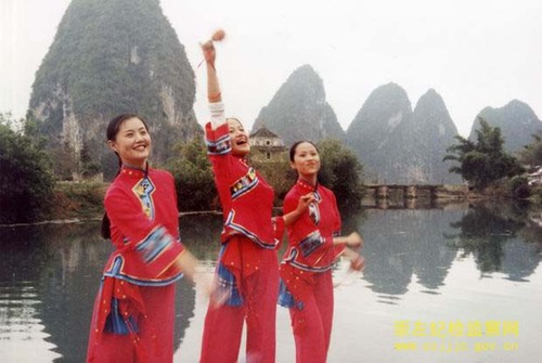 抛绣球是壮族人民喜闻乐见的传统体育项目。它的历史可追溯到2000多年前。当时用以甩投的是青铜铸造的古兵器“飞砣”,并且多在作战和狩猎中运用。随着社会的进步,物质生活的提高,飞砣也逐渐发展成现在的绣花布囊即绣球。绣球是姑娘们用手工做成的彩球,以圆形最为常见,也有椭圆形、方形、菱形等。绣球大如拳头,内装棉花籽、谷粟、谷壳等,上下两端分别系有彩带和红坠。人们在茶余饭后互相抛接以娱乐身心,起到沟通感情的作用。随着历史的发展,后来逐渐演变成为壮族男女青年表达爱情的方式。