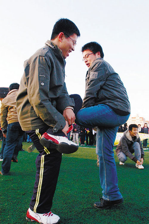 双飞舞跑:又称“二人三足赛跑”、“三条腿走路”。冰上、陆上皆可。它起源于清朝花样滑冰“双飞舞”。1644年,清朝迁都北京,为加强中央政权的军事力量,确定了八旗常备兵制。八旗兵每月练习弓马6次,春秋季则集中操练马步骑射和火器。农历十月,清宫廷在北京北海冰面奏阅八旗子弟兵滑冰技术。据《清朝文献通考》记载和乾隆年间宫廷画师作品描绘,参加检阅的人数达1600名(每旗各200名)。检阅分作两队,一队穿红马褂,黄背心;另一队穿黄马褂 、黄背心,背后皆按其籍插上正白、正黄、镶白、镶黄等色小旗。士兵裹皮护膝,脚上穿装有冰刀(铁条)的皮靴。冰场并立3座高大的门,两队各自成两路纵队,分别从门洞里穿梭往来,形成一个螺旋形大圈,场面非常宏伟。检阅项目有速度滑冰、花样滑冰、冰上球赛、冰上杂技、滑冰射箭等。花样滑冰有“探海”、“大蝎子”、“金鸡独立”等名目。
