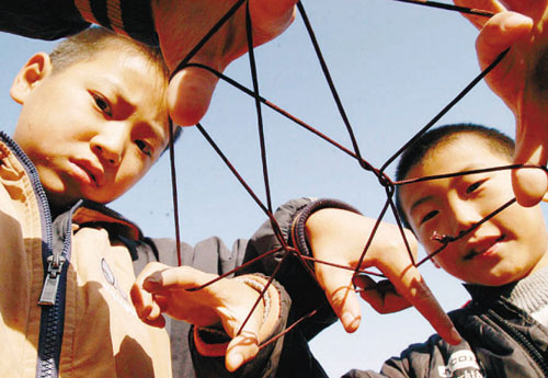 翻绳:又称“解股”,为满族女孩子喜欢玩的一种游戏。玩这种游戏需要两个人,首先以细蝇结成绳套,一人先将细绳在双手上翻出花样,然后另一个人用两手将之翻成新的花样,相互反复翻绳,直至不能再翻或翻乱方算输。