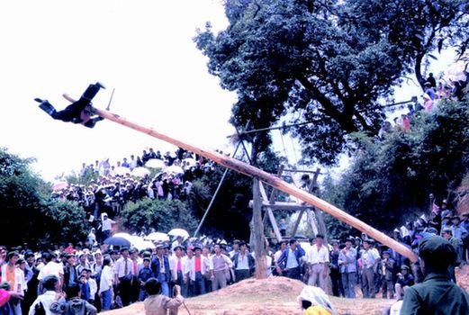 哈尼族民间体育活动主要有坐骑秋千、摔跤、赛球等三项。摔跤和赛球状况与汉族等同,只有打秋千颇具本民族固有特色。他们的秋千分作荡秋、转秋和磨秋三种。荡秋绳为牛皮条结扎或用藤条扭扎而成,可单人荡或双人荡。转秋状如巨型纺车,安于轴心上的四对飞叶之间的横木上架设着四个小荡秋,每个荡秋乘坐一人,随着轴心及飞叶的旋转而旋转。磨秋是一根横架在一条直立竖木顶端的长木杆,秋杆两端可上下升降,又能循环旋转。两端坐骑人数相等,一边坐骑的人用脚猛力蹬地腾空而起,对方下降双脚落地,又蹬地腾空而起,秋杆便不断地起落飞旋。坐骑秋千不仅是节日期间习俗性的娱乐活动,而且是一项精彩的健身体育表演。
