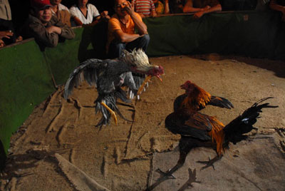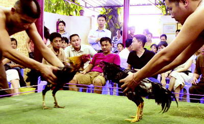 斗鸡观赏性很强,但还有不少“门道”。比赛前的斗鸡场内,来自不同地方的斗鸡,被编了号笼养在一间不得随意进入的屋子里等待“战斗”;“擂台”是一个4平方米、四周拉着绳子的四方平台,如同微型拳击台。斗鸡开场就很有意思:两只斗鸡一只罩在竹笼里,一只关在木制暗箱内。竹笼里的是上场的胜者,暗箱里的是攻擂者。猜胜的斗家们不断上前,用夸张的动作摇动暗箱,耳贴箱壁听其中的动静,或拎起来掂重量,据说这样可以大致知晓箱中斗鸡的状态。而此时,笼中的守擂鸡已等得不耐烦,梗着脖子“咯咯咯”地邀战。