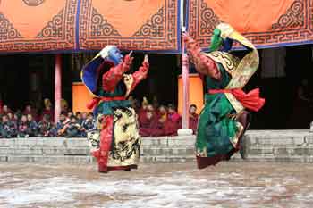 紧接下来的是,一组组具有专题宗教内容的神祇舞蹈,如突出显示神灵无上威力的“法神舞”、“凶神舞”、“金刚神舞”,表现地狱中小精灵们相互玩耍、嬉戏的“骷髅舞”,为人间带来福禄的“鹿神舞”,宣扬乐善好施、长命富贵的“寿星舞”、“仙鹤舞”,以及表演佛经中“舍身饲虎”、“因果报应”等佛经故事的舞段,令人目不暇接。