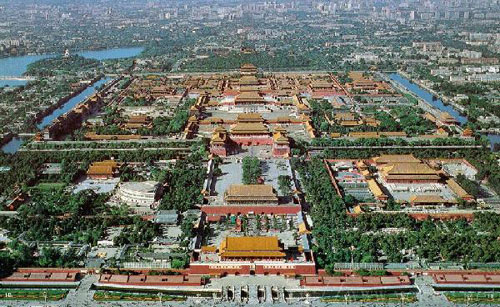 故宫又名紫禁城,位于北京市中心,天安门广场北1,000米、景山南门对面,东西宽750米,南北长960米,面积达72万平方米,共有宫殿房舍9000多间,是中国现存规模最大、最完整的帝王宫殿和古建筑群。在世界宫殿建筑群排名上也居于前列。始建于1406年(明朝永乐四年),作为明清两个朝代的皇宫先后有24个皇帝在此执政。宫墙周长3千米,墙高近10米,底宽8.62米;并有宽52米、深6米的护城河环绕。故宫的建筑部局严格分成外朝与内廷两大部分。外朝包括有以太和、中和、保和三大殿为中心的一组建筑。其中太和殿最为高大、辉煌,它宽60.1米,深33.33米,高35.05米。皇帝登基、大婚、册封、命将、出征等都要在这里举行盛大仪式,其时数千人山呼“万岁”,数百种礼器钟鼓齐鸣,极尽皇家气派。太和殿后的中和殿是皇帝出席重大典礼前休息和接受朝拜的地方,最北面的保和殿则是皇帝赐宴和殿试的场所。内廷包括乾清宫、交泰殿、坤宁宫、御花园及东西六宫等,是皇帝处理政务和与皇妃、皇子起居生活的地方,俗称"三宫六院"。故宫正门即午门,它与南面的端门、天安门构成了一个南北狭长的前庭。故宫北门是神武门,东为东华门,西为西华门。城墙四角还耸立着4座角楼,造型玲珑剔透。故宫外朝部分建筑高大威严,内廷则是精巧别致,所有建筑排列在中轴线上,东西对称,秩序井然。故宫以其豪华壮丽、气势磅礴的东方古典建筑艺术风格和保存的大量稀世文物而闻名于世。