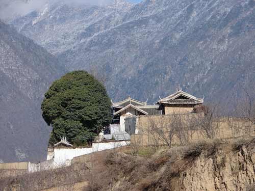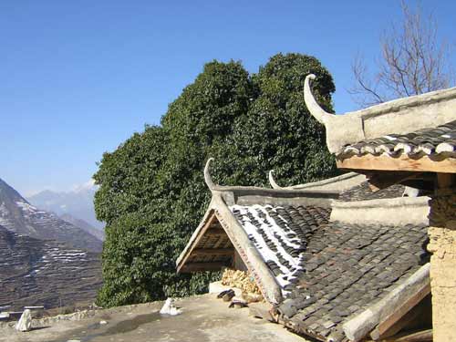 资料图:这棵长在石头上女贞树四季长青,成为萝卜羌寨一大风景线