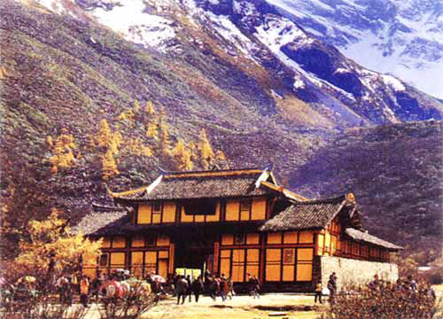 黄龙寺位于四川省松潘县黄龙沟景区的顶端,距黄龙沟口约3.5公里。背倚玉翠峰,面向黄龙谷,是一座古朴大方的木结构建筑。建于明代,因相传黄龙真人养道于此,故名。共有前、中、后三寺,全部随山势而建,规模宏伟,风格独特,现存有观音殿、十八罗汉塑像等。寺后有一黄龙洞,深不见底,洞内遍布钟乳石,千姿百态。洞中还有建于明代的三尊坐佛,如今身上已披满钙化结晶,是人工与天工完美结合的产物。