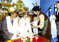 在藏族婚礼上,来宾向新郎、新娘献哈达