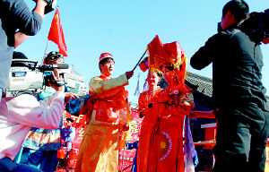 在这一切都准备好了以后,迎亲人们便在原订日子的前一天就动身了。打旗的,打灯笼的以及吹鼓手走在前面,后面跟着是12匹对子马,马上坐着年轻的伴郎。在伴郎的后面是披红戴花的新郎,再后面就是接新娘所用的花轿了。这娶亲的队伍沿途每到一个亲友家,亲友都要给新郎送礼披红。
