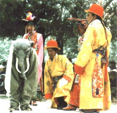 藏戏传统剧目普遍带有宗教演义性质,像历史人物剧《文成公主》中,松赞干布被演绎成观音菩萨的化身,文成公主则是绿度母的化身;《朗萨雯蚌》是根据当时现实社会生活中一个真实事件写成的剧目,但其宗教色彩从头贯到尾,把农家女朗萨的苦难当作佛教“四大皆空”教义的形象印证,她的不幸遭遇也成了她演变成女菩萨的必然过程。传统藏戏中完全属于宗教演义剧目的有《智美更登》《云乘王子》《德巴丹保》《日琼巴》《猎人贡布多吉》《释迦十二行传》等。但真正被长期广泛传演的宗教演义剧仅有《智美更登》,它褒扬佛教利他主义信徒,在被冤屈流放的境遇中仍然坚持乐善好施,最后将儿女、妻子,以至自己的眼珠都献给乞丐。该剧是《大藏经·方等部》中《佛说太子须大(上奴下手)经》的直接演绎,但剧中开头部分写五于智美更登广作施舍,被敌国利用,派人装扮成叫化子骗去了传国之宝,这又被奸臣抓住把柄而告了状,使国王下令流放了王子智美更登。这样一个很有生活气息的生动的传奇情节,显然是从民间吸收了营养的。所以藏戏作品也普遍保持了民间创作的浪漫色彩。