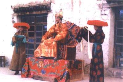 反映历史上松赞于布与文成公主的唐蕃和亲佳话的剧目《文成公主》,着重描写噶尔东赞去长安,事先带了松赞于布王的三封密函,回答了唐皇三次考问,又与财国波斯、军国格萨尔、强国霍尔、佛国印度的婚使一起,经过“穿珠”“辨马”“认鸡”“分木”“宰吃羊肉”“夜宴回店”和最后“校场选主”七次智慧的比试,全部获胜,才终于娶得了公主。这出剧主要是根据历史故事编撰排演的,所以也都带上了十分强烈的民间传说的传奇色彩。