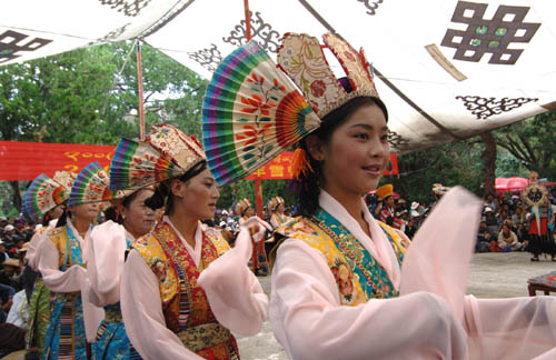 七月十六日以后,觉木隆藏戏队可去拉萨城区以外的地方演出,外地个别团体也有被邀去城外郊区演出的,但一般都开始纷纷回到本地区去。如江嘎尔、迥巴、香巴三个团体首先回日喀则,参加扎什伦布寺的“色莫钦波”宗教艺术节,给班禅大师和堪厅僧俗官员及群众献演各自的藏戏。然后再回到各自的家乡,给头人和寺庙及群众进行汇报演出。再如扎西雪巴在罗布林卡演出结束后,还要到拉萨西郊冬嘎和贡德林寺各演出一天,然后回山南赶在开始收割前,给凯墨谿卡头人和扎西曲德寺高僧,以及家乡的僧俗群众演几天戏。