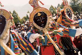 六月二十九日清晨,由扎西雪巴第一、迥巴第二,下边按江嘎尔、香巴、觉木隆、塔荣、伦珠岗、朗则娃、宾顿巴、若捏嘎、希荣仲孜、贡布卓巴排列顺序,一个个团体相继到布达拉宫左右相对的两个大门口演出“谐泼”,即表演各团体的传统开场仪式。据说开始时第一是宾顿巴,因为它是汤东杰布创建的第一个戏班,也因为它是倡导举行雪顿节的五世达赖家乡琼结的戏班子。还据说居第二的本来是觉木隆,后因它戏演得好,最受人欢迎,所以放到蓝面具班子的最后去压阵。然后十二个团体一起到布达拉宫白宫顶德阳厦大平台上去集体上演,但各演各的“谐泼”。孜恰官员或派人在此查点各团体到场人员,实际上也就是各戏班子向孜恰勒空报到。报到完毕,又到罗布林卡东大门口,也由一个个团体相继表演“谐泼”。这一规定,据说是1951年春十四世达赖亲政后新作出的。之后,戏班子悉数进人罗布林卡,在露天戏台上给端坐于观戏楼上的达赖喇嘛表演“谐泼”,实际上是觐见达赖喇嘛。为此,达赖的侍从官要给各团体的汤东杰布塑像或唐卡像献上阿细或朗翠哈达。当晚,这些团体多数返回哲蚌寺。