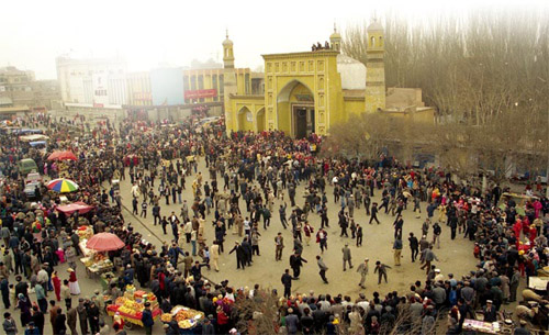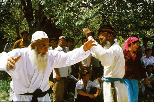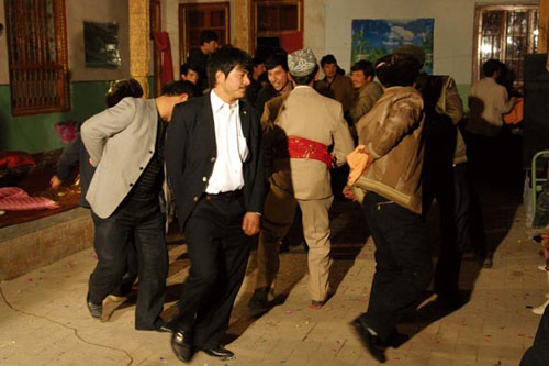 伊斯兰教传入新疆以后,统治者也利用了萨玛这一民间舞蹈形式进行宗教活动。例如,把两手高举的动作,解释为“胡达(上帝)在天上”,一手扶胸的动作解释为“胡达在心里”……虽然跳萨玛时有唢呐吹奏,铁鼓敲打,但不准欢笑,舞者的情绪和舞蹈的气氛是肃穆庄严的。在寺院屋内举行的萨玛,没有音乐,随着阿訇的祷词,边舞边喊着有节奏的“哦呜--哦呜!”的呼声。但是在民间的娱乐场合,群众跳萨玛时,仍充满欢快的气氛。