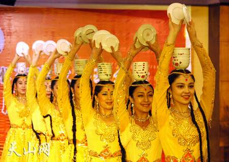 顶碗而舞,是中国许多少数民族极为喜爱并极其流行的舞蹈形式,特别是在新疆、内蒙等地区,历经悠久岁月的磨砺而愈加受人欢迎。这类舞蹈奇就奇在技与艺的交融性上,对舞蹈演员的要求极高,往往需要长时间的训练。演员们不但要练就过硬的舞艺,更要具备高超的顶技,而正是这两者完美和谐的结合与展示,带给人以赏心悦目的艺术享受。