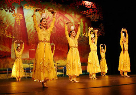 维吾尔族民间舞蹈“顶碗舞”是一个集民族性、民间性、技巧性和欣赏性为一体的女子集体舞。它表现了在节日里年轻美丽的维吾尔族姑娘头顶茶碗,载歌载舞,喜迎宾客,欢庆节日的庆典场景,抒发了维吾尔族人民热爱生活、热情好客的真挚情感。舞蹈开始,每人头顶六只茶碗的姑娘迈着舒缓而端庄的舞步,用手上的顶针和小碟敲击着节奏。表现的是节日里年轻美丽的维吾尔族姑娘头顶茶碗,载歌载舞,喜迎宾客,欢庆节日的庆典场景,抒发了维吾尔族人民热爱生活、热情好客的真挚情感。