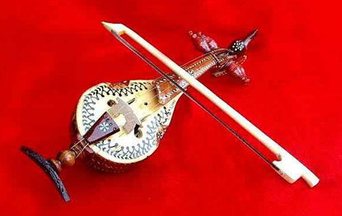 胡西塔尔全长约80厘米,外形和西洋乐器曼陀林相似。由琴头、琴颈、共鸣箱、琴马、系弦板、弦轴、琴弦和琴弓构成。琴头雕刻以百灵鸟形,下设弦槽和弦枕,左右各置核桃木弦轴两个。用以缠绕主奏弦,琴颈较短,正面胶有指板。共鸣箱采用桑木或杏木制作,由6 块木板胶合而成,外形似瓢状,正面蒙以梨木或白松面板。琴的底部设有“人”字形支架。4 根主奏弦通过面板上的琴马,拴在系弦板上,在琴须左侧还没有七条共鸣弦。也通过琴马控系在琴箱底部。主奏弦采用小提琴弦,共鸣弦使用钢丝弦。琴弓采用小提琴弓。