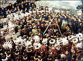 在苗族青年男女中,最常见也是他们最喜爱的集体舞蹈叫《踩堂》,每逢年节举行《踩堂》时,由英俊男子组成的芦笙队,人人手把芦笙边吹边晃动着躯体绕坪而来。高昂而清脆的芦笙调,在发自坪中心雄芦笙柱下的低音“芒筒”与噹噹作响的铜鼓声中,乐曲更显雄厚、和谐。紧接芦笙手之后,一队不曾粉黛的二八妙龄,在霓彩绣衣衬托下,佩戴于头、身之上重达十几斤、精工细作、熠熠生辉的银帽、银簪、银项圈、挂牌、银手镯等饰物,随走动而叮叮作响,使她们个个宛如仙子下凡、龙女遨游。她们各自凝聚着心头的美好的夙愿,含情默默、款款而来。