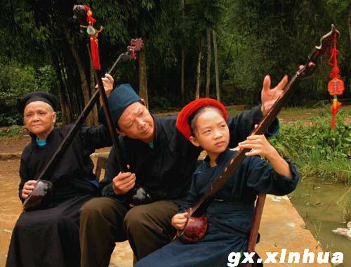 传说在很早以前,在十万大山南麓的壮族偏人山寨里,有一对非常要好的青年人,男的叫农端,女的叫农亚,两人经常结伴上山砍柴。有一天,两人在一个岩洞口听到洞中传来悦耳的 “叮咚”之声,循声而入看见一个水潭,上面岩壁中渗出许多小水珠正向潭中滴落。他俩听着这美妙动人的乐音,顿觉心旷神怡、耳聪目明。他俩想把这神奇的声音带回山寨去,让乡亲们一起来分享。农亚想了想说道:“我们何不做一个也能发出这种声音的东西呢?”于是二人在山中找来一个葫芦壳、一根木杆,将木杆插进葫芦里,绷上野藤的细丝条,果然弹出 了“鼎叮”之声,恰似“叮咚”的山泉之音。山寨里的人们听了无不拍手称赞,一位长者还以发音把它叫作“鼎叮”。乡亲们照样学做起来,鼎叮很快盛行全寨。琴声传到天上,玉皇大帝派天使下凡将农端、农亚召去,后来他俩在天上成了歌仙,终日给玉皇大帝弹琴唱歌, 难得下凡。为消除乡亲们的思念,每年正月初一到十五,趁天门开启之时,他俩便赶回凡间 与乡亲们聚会歌舞。平时偏人有事相求,也焚香请他们下来歌舞一番。这种活动后来成为固定形式,定名为“跳天”。直到今天,每逢壮族传统节日,偏人都要举行群众性的“跳天”文娱活动。鼎叮则是这种活动中使用的唯一乐器,故此称之为天琴。