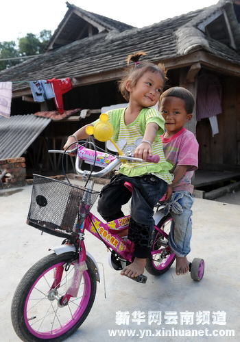在云南省西双版纳傣族自治州勐海县布朗山布朗族乡新曼娥村,两名可爱的布朗族孩子在骑车玩耍(11月22日摄)。 位于中缅边境的云南省西双版纳傣族自治州勐海县布朗山布朗族乡新曼娥村共有83户人家,339人。上世纪70年代,从解放前原始社会末期直接进入社会主义初级阶段的布朗族群众,由于生产力水平低下,长期处于吃粮靠返销、花钱靠救济的困境。十一届三中全会以后,布朗山开始恢复茶叶生产,并种植良种杂交水稻,群众的生活水平逐步提高。如今新曼娥村已成为布朗山的“小康村”,98%以上的农户搬进了新居,大多数村民有摩托车和拖拉机,很多村民还买了汽车,近年来全村适龄儿童的入学率保持在99%以上,村民全部参加了农村合作医疗保险,2007年村民人均纯收入接近3000元。 新华社记者 蔺以光 摄