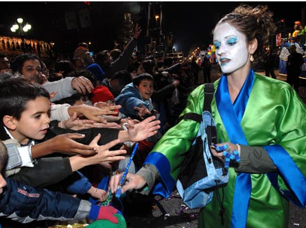 每到三王节当天的傍晚,西班牙人会开始群聚在街上等待花车游行,当载著三国王的花车来临时,花车会开始撒下无数的糖,表示是三国王从遥远东方带来的礼物,此时大人小孩都陷入抢糖的疯狂中。
