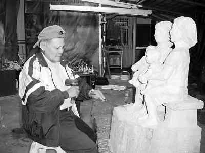 卑南头目哈古正在雕刻木雕作品。