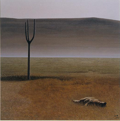 在见到白英之前,我已经看过他的很多画作。《老猎人肖像》、《四方山的神祗》、《根》、《渐渐消失的阳光》……每一幅作品都像一个动人的故事,需要你去细心品味。在白英的画笔下,生活在草原上的人们,牛马,甚至一草一木,都是生活的写照,是北方民族心灵状态的描绘。