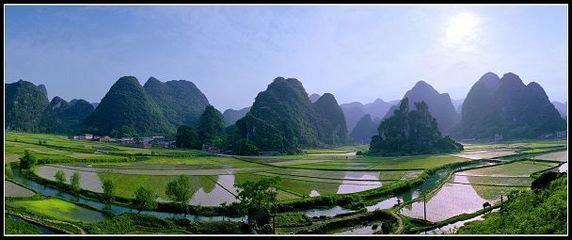 再次,在修辞技巧上,三四两句也堪作范例。诗人运用了对偶、拟人、借代的修辞手法,把山水描写得有情且有趣。山水本是无情之物,可诗人说水“护田”,山“送青”,水对田有一种护措之情,山对人有一种友爱之情,这就使本来没有生命的山水具有了人的情思,显得柔婉可爱,生动活泼。本来水是环绕着绿色的农作物,但诗人没说具体的植物,而是用植物的色彩来代替,说“将绿绕”,环绕着绿意;青色,也是虚的,是没法送的,诗人却说山要“送青来”,这就化实为虚,诗意盎然。事实是湖阴先生的房屋与山距离很近,主人开了门,就会看见青苍的山峰。可如果写成开门见青山,那就全无诗味了,诗人换了个说法,从对面落笔,让山做了主语,化静为动,顿成佳句。