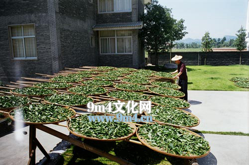 晒青图武夷岩茶在我国茶叶发展史上,谱写了十分重要和光辉的一页。武夷茶在南北朝时(公元479年),就以“晚甘侯”(茶名)著称于世,唐代成为士大夫上层贵族馈赠佳品,宋元两代入贡朝廷,盛极一时。元大德六年(公元1302年),就于九曲溪畔设置御茶园。明代罢造龙团,改蒸青团茶为炒青散茶,随后又改制三红七绿的乌龙茶,即现在所称之岩茶。因而,武夷岩茶始于明朝,盛于清代,十七世纪远销西欧,蜚声四海。