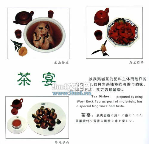 武夷茶宴是利用现代烹饪技术制作,方法繁多,蒸熘爆炒焖炖等都能派上用场,或利用茶汁、或利用青叶、片叶生炸,研末烹汤,切叶混炒,或以茶为主料,或为配料,不一而足。茶宴选取茶叶上并不局限于武夷山特产的红茶和乌龙茶中精品的岩茶,也把绿茶纳入菜肴。这样,能根据客人脾胃的温凉调适,绿茶性惊,红茶火厚,乌龙茶不凉不火,各取所取。