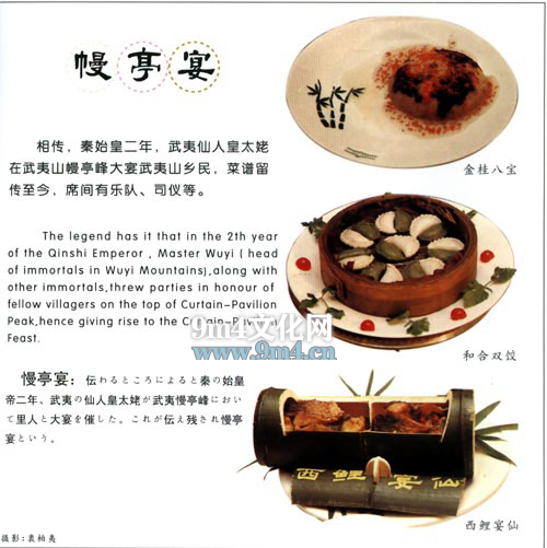 幔亭宴的由来久远而神奇,相传几千年以前,武夷山众仙之首武夷君曾在幔亭峰上设宴招待武夷山乡民,仙凡同宴。此宴传袭至今。宴席开始之前有焚香点烛、锣鼓迎宾、嘉宾入席、敬献清茶和上酒、揭酒、品酒等程序,给人独特的乡村民俗感觉。菜肴有冷碟、热菜、点心、水果四大项,都是武夷山传统名菜、品点、果蔬。