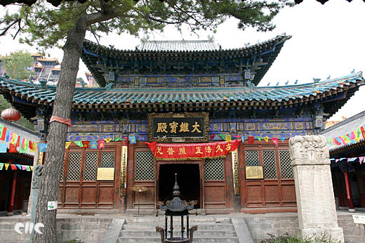 广宗寺在五台山台怀镇北侧营坊村山腰,背依灵鹫峰,面临台怀诸寺,规模不大,布局严谨。明正德初年为生民祈福,迁中相韦敏建寺,铸铜为瓦,赐印令其护持。清代曾予补修。山门三楹,内设木制龛阁,供大肚弥勒佛像;左右钟鼓楼高耸,檐角翠飞,格外醒目。院内殿厢房整洁,大佛殿位居正中,殿为铜瓦盖顶俗称铜瓦殿;其后的藏经阁和禅院,为坐禅及育经之地。铜瓦殿面阔三间,重檐歇山式,比例和谐,结构规整,格扇棂花,雕刻工精,内外彩饰富丽,琉璃脊兽衬以铜瓦古色,别具风格。殿内供三世佛及十八罗汉,龛阁精致,装饰鲜艳。