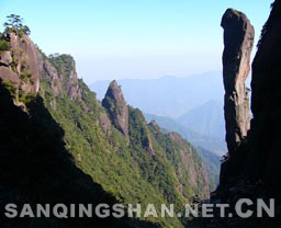 6、 观音赏曲 观音赏曲位于南天门群峰之间。由两座山峰构成,一为观音像,一为葛洪像。相传晋代道士葛洪有感于民间疾苦,以琵琶对天倾诉。琴声感动天庭,观音下凡探访合十聆听,留此法相。此处观音也是三清山观音三法相之一。