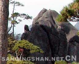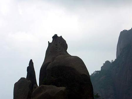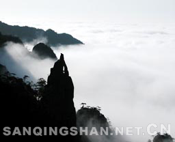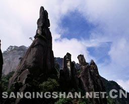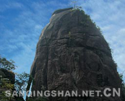 2、 巨蟒出山 巨蟒出山位于南清园北部,三清山标志性景观。海拔1200余米,相对高度128米, 由风化和重力崩解作用而形成的巨型花岗岩石柱,峰身上有数道横断裂痕,但经过亿万年风雨,依然屹立不倒。顶部扁平,颈部稍细,最细处直径约7米,状极突兀,形似一 硕大蟒蛇破山而出,直欲腾空而去。