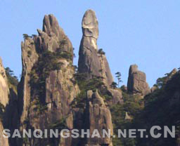 1、 司春女神 司春女神位于南清园东北部,三清山标志性景观。海拔1180余米,通高86米。整座 山体造型就像一位秀发披肩的少女,天地造化,鬼斧神工。亿万年来,女神端坐山峰, 默然注视芸芸众生,神态祥和。传说女神为西王母第二十三女,名瑶姬。世人认为她是春天的化身,因而称之为“司春女神”。