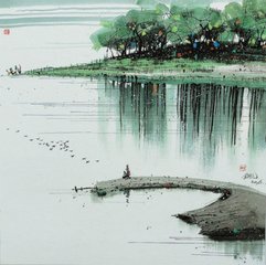 如果说第一句是从视觉和听觉上着笔的话,那末第二句“落日荷花红酣”则是在此之上又加拟人和想象。在古代诗词中,把荷花比作美人是大有人在的,如王建的“荷叶罗裙一色裁,芙蓉向脸两边开”,李璟的“菡萏香消翠叶残,西风愁起碧波间”等,但王诗中不但把荷花比作美人,而且是个喝醉了酒的美人,这似乎更胜一筹。因为这样不但可见美人轻盈之态,而且可赏美人娇艳之色。形体之上再加色彩,当然更觉袅娜动人。那末,这“红酣”之色从何而来呢?这固然由于荷花本身的娇艳,但与落日的斜射也密切相关。那如血的夕阳把它的余辉涂抹在粉红的花辦上,当然更增添了红润的色泽感,这种近似醉后的酡颜也更使人目炫心醉。这一、二两句不但状物称意、对仗工整,而且在布局上也别具匠心。“柳叶”一句写岸上,“荷花”一句写水中。柳高荷低,高处一片绿暗,低处一片红酣,给人一种非常强烈的如临其境的立体空间感受。据南宋洪迈云,“柳叶鸣蜩绿暗”原为“杨柳鸣蜩绿暗”临川刻本改“杨柳”为“柳叶”,“其意欲与‘荷花’为切对,而语句遂不佳”(《容斋四笔》卷七)洪迈认为改得不好。实际上,如上所述,“柳叶”确比“杨柳”好,我倒是以为“临川本”用的是王安石后来修改后的诗句。安石善于锻句,不断修改,其“春风又绿江南岸”就是一个著名的事例。