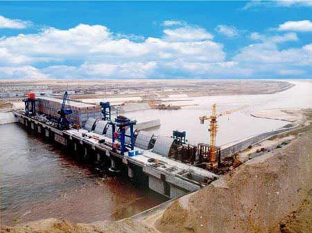 黄河沙坡头水利枢纽主要任务是灌溉和发电。总控制灌溉面积134万亩,总库容2600万立方米,总装机12.04万千瓦。最大坝高37.8米,坝顶长867.65米,坝顶高程1242.6米。河床电站安装4台灯泡贯流式水轮机组,泄洪闸设计泄洪流量6550立方米每秒。枢纽总投资12.8亿元,总建设工期为45个月,计划2003年第一台机组发电、2004年9月底工程竣工。