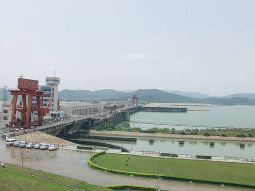 主坝由两部分组成∶溢流坝为混凝土重力坝,共设l6个流流孔,采用弧形钢闸门,其中15孔为带胸墙的泄洪孔,另一孔为排漂表孔:土坝为均质土坝,坝顶-长度1826m,最大坝高28.8m。副坝共3座。总长539.3m,最大坝高27m。船闸为单线一级船闸,最大过闸船队2X500t,上引航道长约l300m,下引航道约l500m。厂房类型为河床式,安装4台单机容量为3.5万kW的灯泡贯流式机组,该机组的转轮直径和单机容量为全国之首。